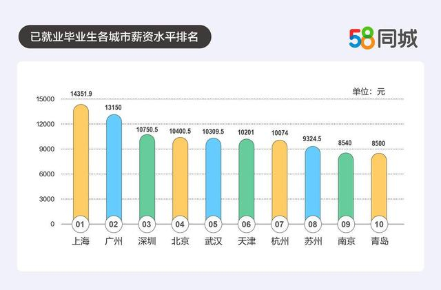薪酬待遇通常是毕业生关注的焦点。从全国各省的薪资水平来看,上海、广东省、湖北省、天津、北京、浙江省的平均月薪酬位居前列且均已过万。而不同城市中,薪酬水平排在前五的城市分别为上海、广州、深圳、北京、武汉,南京和苏州薪资水平也位列前十。