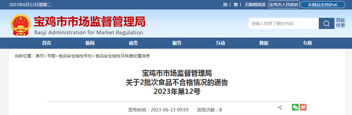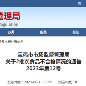陕西省宝鸡市市场监管局关于2批次食品不合格情况的通告(2023年第12号)
