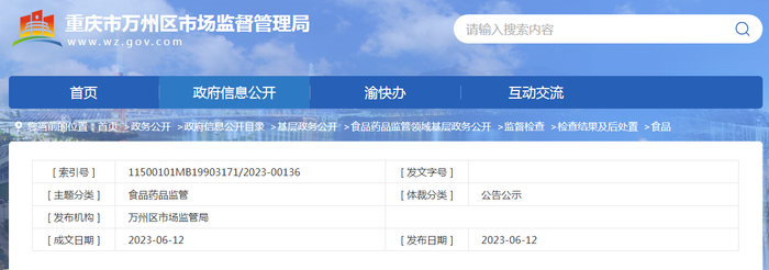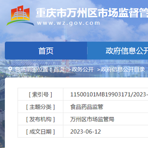 重庆市万州区市场监管局抽检185批次食品 不合格样品3批次