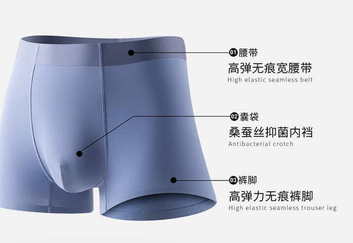 男款内裤,弹力更大、更耐磨、更耐穿的60支长绒棉面料+吸湿吸汗、速干、透气的6A级桑蚕丝底裆。