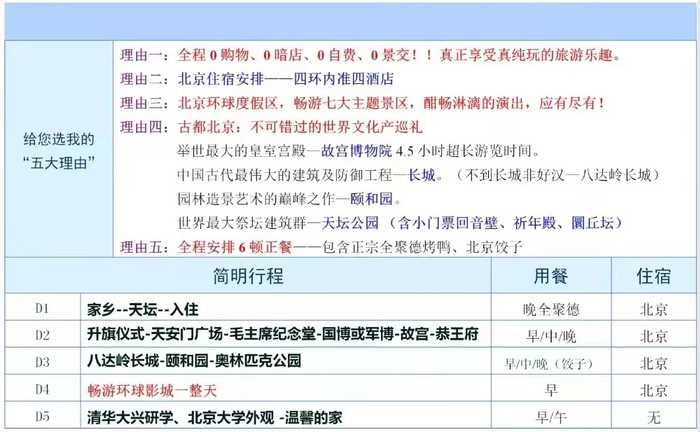 本次行程费用包含4顿早餐,6顿正餐。其中包含了正宗全聚德烤鸭、正宗北京饺子宴。