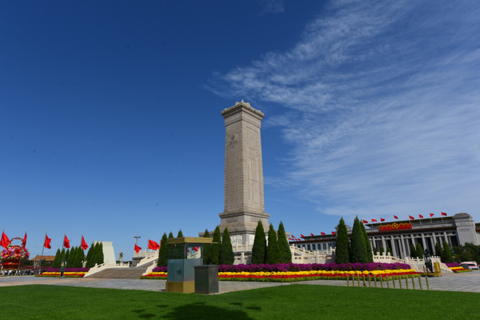 每天清晨升国旗,日落降国旗,是天安门广场上最庄严的仪式。天安门城楼对面就是毛主席纪念堂、人民英雄纪念碑、人民大会堂、中国国家博物馆。