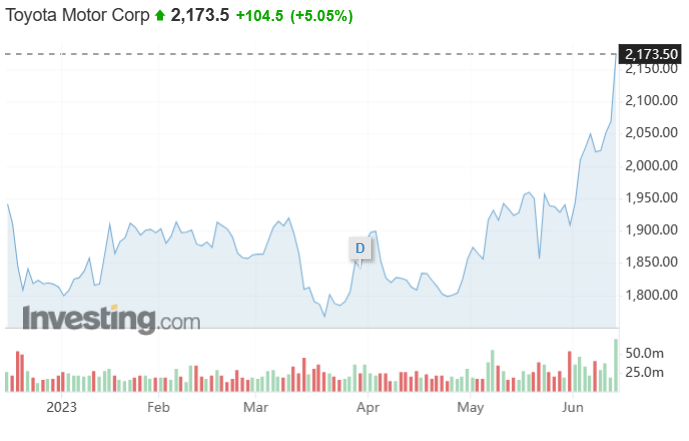 截至周二收盘,丰田股价上涨5.05%,至2173.5日元。