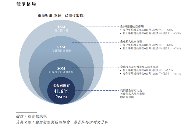 据招股书指出,全球通用航空飞机服务市场含固定基地营运商、保养、维修及大修、备件、升级、培训、保险及融资在内的服务。对于大多数拥有大规模且机龄较高的机队的顶级飞机制造商来说,相关服务可贡献高达35%至40%的收入。此外,由于终端客户对售后维修服务的需求,零部件的销售收入往往比新交付飞机的销售收入更为显著。