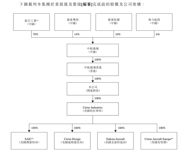招股书显示,西锐飞机的股权由中航通飞香港100%持有,中航通飞香港由中航通飞全资拥有,而中航通飞由航空工业持股70%、广东粤财投资控股有限公司持股14%、广东恒健投资控股有限公司持股10%、珠海格力航空投资有限公司持股6%。