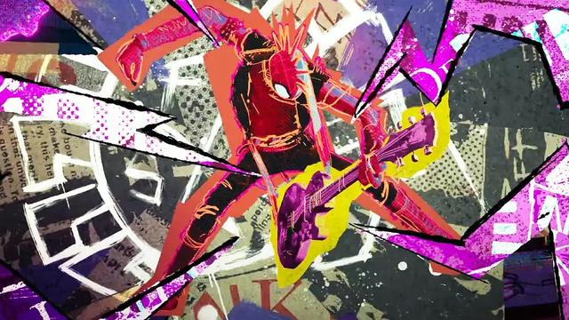 影片最特别的一个角色,当属朋克蜘蛛侠霍比。他留着莫霍克发型,身背一把吉他,满满的英伦朋克范儿。其形象是用大量不同颜色的拼贴画构成,造成一种快速、凌乱、粗糙的感觉,以区分主流美学类型。