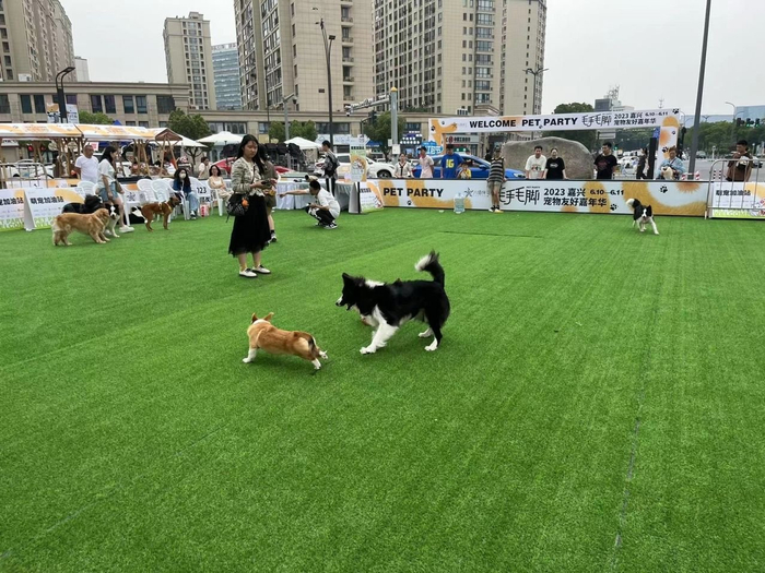 6月11日下午, 2023嘉兴宠物友好嘉年华在华府八佰伴举办。“毛孩子”们在商场前的绿地上奔跑嬉戏,与围栏边举着“长枪短炮”拍照的市民互动,随着一条边境牧羊犬利落地叼起抛出的飞盘,人群中爆发出阵阵欢呼声。在商场地下一层,带着宠物的消费者将宠物零食、驱虫用品、宠物体检套餐和为“萌宠”提供手绘扇面服务的摊位围得水泄不通。