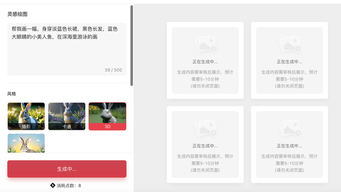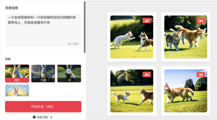 记者在官网注意到,本次上线的AI灵感绘图功能,根据文字,可以生成摄影、卡通、3D、插画四种不同风格的图片素材;内测账号有一定的点数限额,每生成一次图片(共4张图)将消耗8个点数。