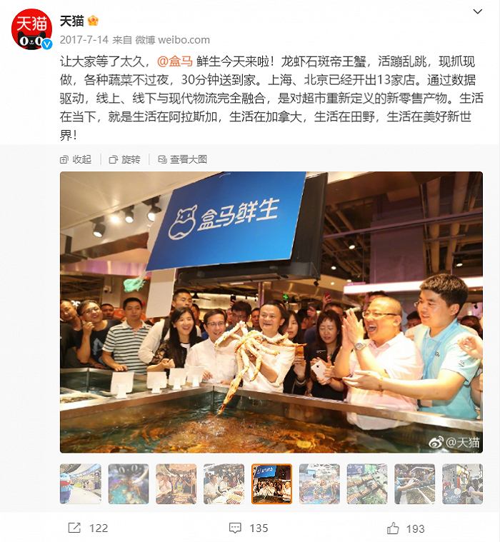 马云现身,算是官宣了盒马跟阿里的关系。天猫官方微博“顺势”官宣了盒马鲜生的到来,并介绍称:通过数据驱动,线上线下与现代物流完全融合,是对超市重新定义的新零售产物。