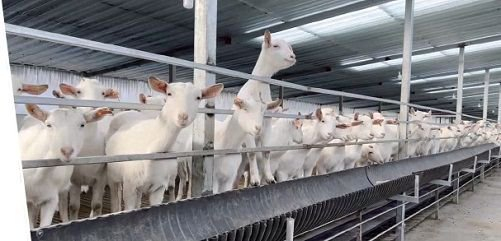 宜品宜羊千僖羊牧场的奶羊正在等待饲养员统一饲喂优质全价饲料。