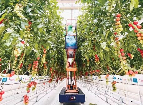 走进凯盛浩丰(莱西)智慧农业产业园,即刻会被这里的智慧玻璃温室所吸引:番茄植株向上延伸最高可以生长到16米,与传统植株相比犹如参天大树;210亩的超大单体智能玻璃温室内只有寥寥几个工人,用工极少。但这却不影响每天超过40吨新鲜番茄从这里发往全国各地。