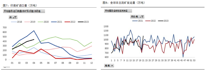 海外主流矿山生产平稳,受天气影响有限,预计今年大都能完成年度目标,且处于目标区间的中上沿。海外非主流矿山稳中有增,其中印度增量较为显著。海外矿下半年仍能保持强劲生产发运,预计全年产量较去年增加4000 万吨。