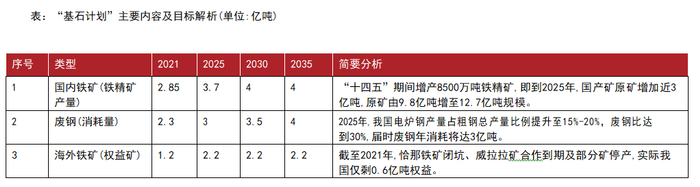 “基石计划”主要从铁资源三大主要来源入手,明确保障目标的三大时间节点,分别为2025年、2030年、2035年,同时明确两级推进体制,包括国家主管部门和重点地区主管部门,以及明确两类实施主体,包括钢铁企业和专业化矿产资源企业集团,主要措施内容包括三方面。
