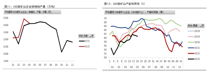 1-4月,国产矿铁精粉产量9363万吨,较去年同期增加1.1%,增加105万吨。国产矿产量维持稳定,若未出现重大安全事故情况下,预计全年产量较去年增加300-400万吨,增量主要来自华北产区。从矿山产能利用率上看,利用率不高,预计出现因过度生产而引发安全事故的概率较低。