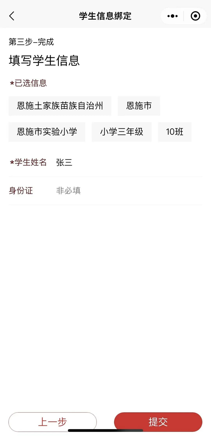 点击“新增”,选择“地区、就读学校、年级、班级”,填写学生姓名、身份证号码(选填,和同班同学有同名情况的学生必填),确认无误后提交。