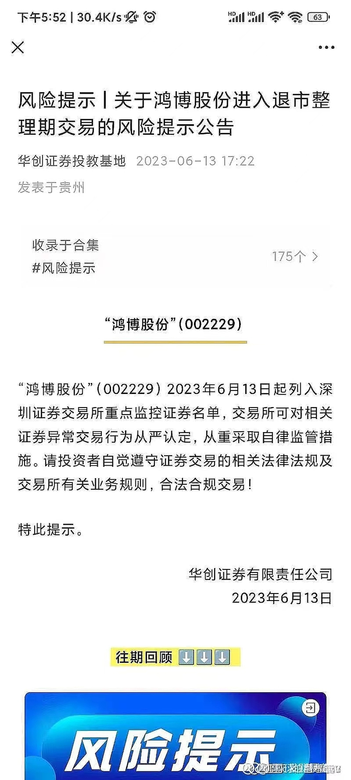 6月13日傍晚时分,一则标题为“风险提示|关于鸿博股份进入退市整理期交易的风险提示公告”微信公众号截图在网络平台迅速传播。相关截图显示,此“公告”的来源为“华创证券投教基地”公众号。
