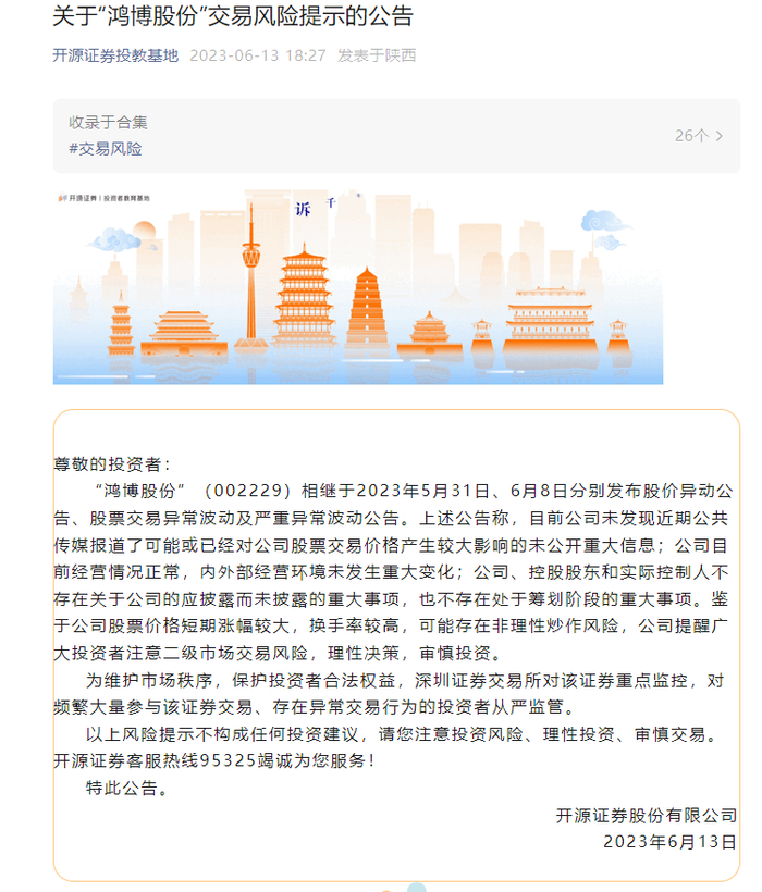 值得一提的是,6月13日收盘后,开源证券、广发证券、银河证券、安信证券等多家券商的公众号都发布了另一条与鸿博股份的相关消息。例如,开源证券投教基地公众号曾发布关于“鸿博股份”交易风险提示的公告,相关正文的核心内容与上述截图所显示的正文内容基本接近, 均指出深交所对该股重点监控,将对存在异常交易行为的投资者从严监管。