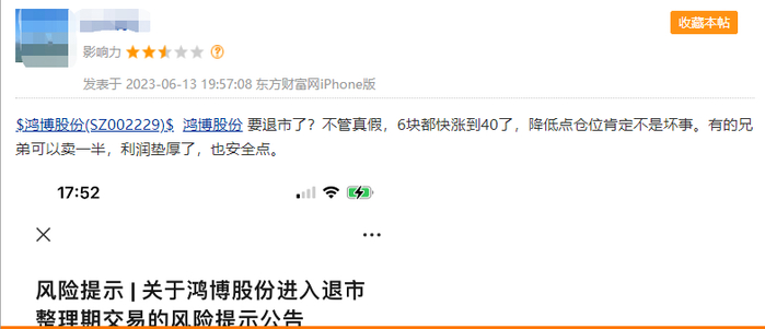 尽管截至目前鸿博股份从未发布过与退市有关的任何公告,但仍有不少投资者在6月13日晚间关注到了上述错误信息。在同花顺、雪球、股吧等主流投资者社区,都能找到上述截图的传播,引发不少投资者跟贴评论。一些投资者担忧,上述消息的出现是否可能会在短期对公司股价造成影响。