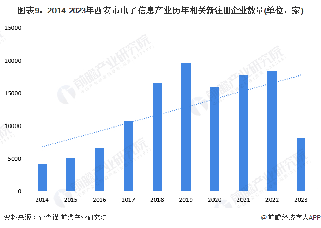 根据企查猫数据西安市,近年来西安市电子信息历年新注册企业数量总体保持上涨趋势,2018-2022年维持在高位波动。截至2023年6月8日,西安市电子信息产业相关注册企业超过130000家,其中2019年为新注册企业数量最高峰,达19539家;2023年1-6月,西安电子信息产业注册企业数量为8061家,2023年依旧有望维持在高位。
