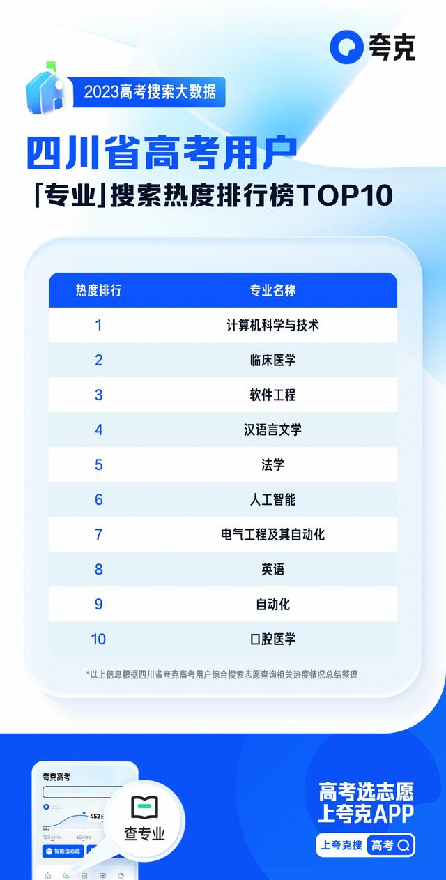 根据夸克数据显示,成都理工大学、西南石油大学、四川大学成为四川省考生搜索热度最高的大学。而在专业方面,计算机科学与技术、临床医学、软件工程获得本省考生的关注。
