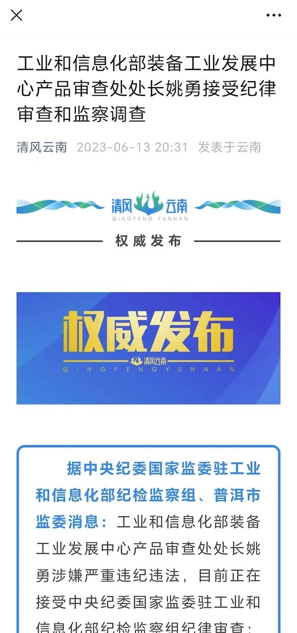 据中央纪委国家监委驻工业和信息化部纪检监察组、普洱市监委消息:工业和信息化部装备工业发展中心产品审查处处长姚勇涉嫌严重违纪违法,目前正在接受中央纪委国家监委驻工业和信息化部纪检监察组纪律审查;经云南省监委指定普洱市监委管辖,姚勇正在接受普洱市监委监察调查。