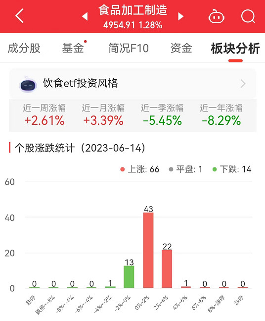 中国经济网北京6月14日讯 今日,食品加工制造板块整体涨幅1.28%,其中,66只股票上涨,1只股票平盘,14只股票下跌。