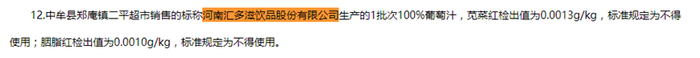 该抽检信息显示,标称河南汇多滋饮品股份有限公司生产的1批次“汇多滋+图案”100%葡萄汁(生产日期/批号:2023/2/8),苋菜红检出值为0.0013g/kg,标准规定为不得使用;胭脂红检出值为0.0010g/kg,标准规定为不得使用。