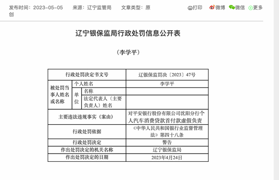 2023年5月5日,因个人汽车消费贷款首付款虚假,平安银行沈阳分行被处以罚款50万元。与此同时,多名负责人分别被处以警告。