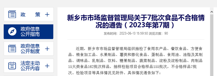 中国质量新闻网讯 2023年6月13日,河南省新乡市市场监督管理局发布关于7批次食品不合格情况的通告(2023年第7期)。