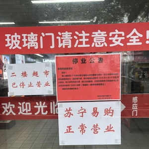 14日下午2时许,一楼正常营业的苏宁易购客流稀少,苏宁易购店内,随处可见“二楼超市已停止营业”“苏宁易购正常营业”的提示牌。