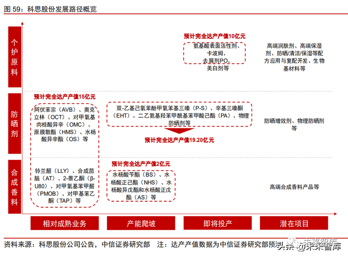 成熟防晒、香料产品筑基,新项目打开成长空间。我们据公司主要产品当前所处的阶 段对公司发展路径进行了厘清:已经相对成熟的 AVB、OMC、HMS 等防晒剂产品以及 LLY、AT、PMOB 等香料 产品所处市场格局长期稳定,构筑公司收入基石,我们预计完全达产后产值或达 15 亿元;P-S、PA、EHT、物理防晒剂及部分合成香料产品正处于产能爬坡期,随产能贡 献增量收入,我们预计处于产能扩张/爬坡期的防晒剂产品完全达产后产值或达 19.20 亿元;BS、NHS、AS 等香料产品规模相对较小,我们预计完全达产后产 值约 2 亿元;卡波姆、去屑剂 PO、表面活性剂等产品正在产能建设期,是公司向日化领域拓 展的重要项目。日化领域项目投产规模相对较大,我们预计项目完全达产后产值 或达 10 亿元;公司有望成为个护原料领域的国内龙头,并拓展生物基材料等潜在新机遇,打造 远期发展方向。风险因素:产品价格波动风险;产能释放进度不及预期;新品销售不及预期;行业竞 争加剧;原材料价格波动风险;汇率波动风险。