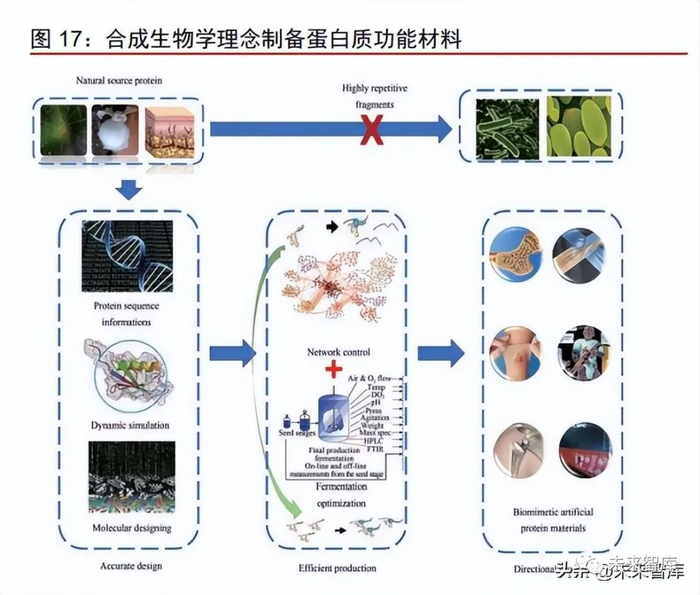 合成生物学技术以“基因调控,工程设计”为核心,用于产品的精准化设计与高效合 成,致力于实现人类对可持续发展工业模式的期待。目前以合成生物学的科学理念为指导, 对生命体进行不断改造与优化,以实现细胞工厂定向合成蛋白,结合理性设计的材料模块, 赋予蛋白质在生产过程的智能可控以及性能的更新升级是当下研究的热点。