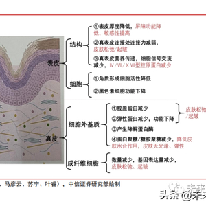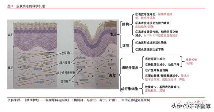 皮肤衰老的生物学机理:表皮结构的衰老、表皮细胞的衰老、真皮层的衰老。人体皮 肤衰老的生物学机理主要体现在三个方面:第一,皮肤表皮结构的变化,①皮肤的表皮厚 度减少,导致皮肤屏障功能降低,对刺激物的敏感性提高;②真表皮连接处的连接力出现 减弱;③真表皮连接处营养传递,细胞信号交流减少,Ⅳ/Ⅶ/ⅩⅦ型胶原蛋白减少。第二, 皮肤表皮细胞的变化,①角质形成细胞活性降低;②黑色素细胞功能下降。第三,真皮层 的变化,①细胞外基质中胶原蛋白、弹性蛋白减少且功能下降,导致皮肤松弛、起皱;②产生降解蛋白酶;③蛋白聚糖/糖胺聚糖减少,降低皮肤水合作用,皮肤无光泽、弹性;④ 成纤维细胞数量减少、基因表达量减少,导致皮肤松弛、起皱。