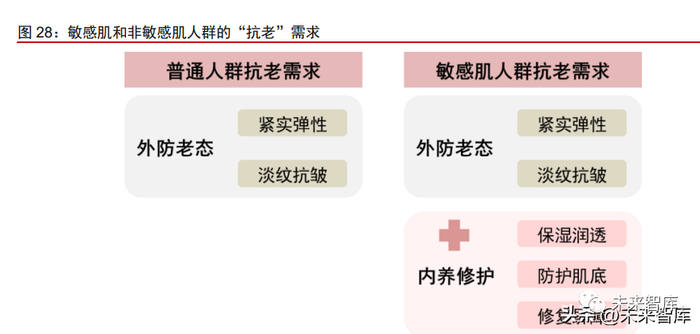 功效精细化:精细化抗衰、修复,皮肤全层次抗衰。品牌对抗衰、修复功效愈发精细 化——自然衰老、光损伤修护、敏肌抗衰等。敏肌抗衰。敏感肌消费者追渴望“抗衰+修护”的深度需求。由于人体肤质的不同, 普通人群抗衰追求外防老态,关注皮肤的紧实弹性、淡纹抗皱;而敏感肌人群在抗衰时更 加理性,注重肌底屏障的修养,逐渐形成“抗衰+修护”的内外结合逻辑。