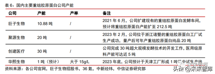 国内重组胶原蛋白公司产能各异,生产技术均处于持续优化通道中,未来技术突破有 望带来成本降低,进一步扩大重组胶原蛋白应用场景,拉动需求形成良性产业循环。产能 方面,巨子生物重组胶原蛋白产能 10.88 吨,2021 年 6 月公司计划扩建现有的重组胶原 蛋白发酵车间,预计将重组胶原蛋白产能扩至 212.5 吨;聚源生物重组胶原蛋白产能约 20 吨,2023 年 2 月公司位于浙江诸暨的重组胶原蛋白工厂试生产成功,量产后可年产重组 胶原蛋白纯品 20 吨;创建医疗完成 30 吨超大规模发酵技术的开发工作,医用级原料产能 可达近 5 吨;华熙生物预计于 2023 年底在天津工厂形成 1 吨级中试生产线。