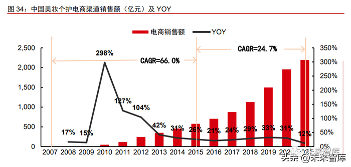 中国美妆个护电商渠道销售额增速放缓。根据 Euromonitor 数据显示,2007-2015 年 中国美妆个护电商渠道销售额由 10 亿元增长至 583 亿元,8 年 CAGR+66.0%,渠道销售 额占比由 0.7%增至 18.3%;2021 年,中国美妆个护电商渠道销售额为 2197 亿元,同比 +12%,增速同比-18.4ppts,对应 2015-2021 年美妆个护电商渠道销售额 CAGR+24.7%, 渠道销售额占比由 18.3%增至 38.6%。