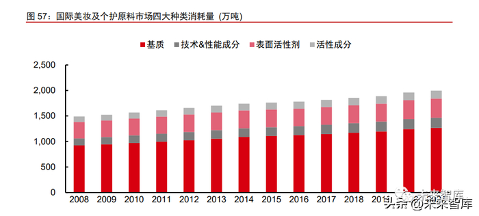 活性成分在美妆领域用量有限,市场规模相对较小。四大类化妆品原料中,从消耗量 来看,活性成分占比最低,基质占比最高。2021 年国际美妆及个护原料消耗量上,基质、 表面活性剂、技术&性能成分、活性成分的消耗量分别达到 1265.98 万吨、376.01 万吨、 199.87 万吨和 155.15 万吨,占比分别达到 63.4%、18.8%、10.0%、7.8%。