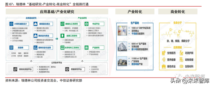 基础研究方面,公司搭建绿色生物制造平台,从应用基础研究(计算机辅助设计/构建 资源库/重组蛋白表达/酶改造和筛选/菌株改造与选育)到产业化研究(酶催化工艺/发酵工 艺/化学材料工艺/中试放大/产品研究),同时辅以公共技术平台的高通量自动化筛选、质量 研究做支撑,以实现高效创新研发和生物智造。产业转化方面,公司建有三处生产基地,深圳基地支持千克级功能原料生产;甘肃基 地支持数十吨高附加值原料;广东珠海基地拥有数百吨级产能。商业转化方面,公司实现 以氨基酸、核苷酸、糖为单体的“生命分子”商业化生产和业务解决方案,产品应用覆盖 功效护肤、生物医药、营养健康、动物保健、绿色农业、生物材料六大领域。