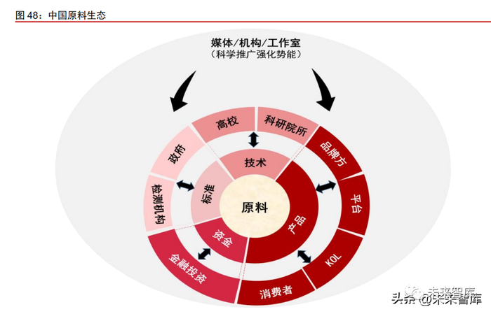 中国原料生态初具雏形。产学研体系搭建,合作海外内知名高校、科研院所;建立与 品牌方/平台/KOL/消费者高效链接;政府规范引导发展,功效检测机构提供验证支持;市 场投融资方兴未艾。媒体/机构/工作室等公共组织积极推广,增强原料生态整体势能。