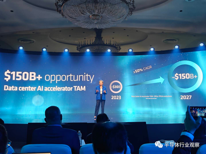 在今天于旧金山举办的产品发布会上,AMD CEO Lisa Su更是直言,我们仍处于 AI 生命周期的非常、非常早的阶段。而根据他们的预估,数据中心AI加速器的TAM到2027年将会达到1500亿美元,这意味着未来四年的CAGR将会超过50%。