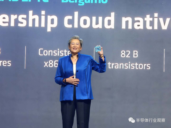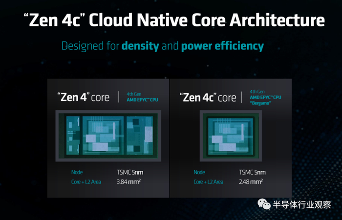 在介绍了EPYC Genoa之后,Lisa着重介绍了公司的云原生产品Bergamo,一款让开发者期待已久的高密度服务器 CPU。据介绍,该芯片基于 AMD 的密度优化 Zen 4c 架构,提供多达 128 个 CPU 内核,比 AMD 当前一代旗舰 EPYC 9004 “Geona”芯片多 32 个内核。在AMD CTO Mark Papermaster看来,Zen 4c是AMD紧凑密度的补充,是公司核心路线图的新泳道,它在大约一半的核心区域提供与 Zen 4 相同的功能。