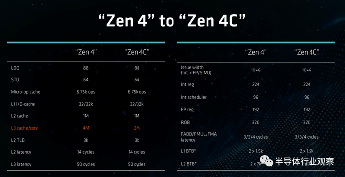 在分析人士看来,Zen 4c 和 Bergamo 设计的目的是提供尽可能多的计算资源,这也是AMD在摩尔定律失效的情况下,为满足尽客户需要继续增加核心数量需求而做出的一个决定。根据AMD提供的数据,全新的Zen 4C核心可以减少35%的面积,在每个CCD中可以提供的核心数量是Zen 4的两倍,在每个Socket中则能增加33%的核心。换而言之,Zen 4 每个 CCD 有 8 个内核,而 Zen 4c 每个 CCD 有 16 个内核。这也意味着 Zen 4c EPYC 芯片的 CCD 总体上少于其原始 Zen 4 芯片。