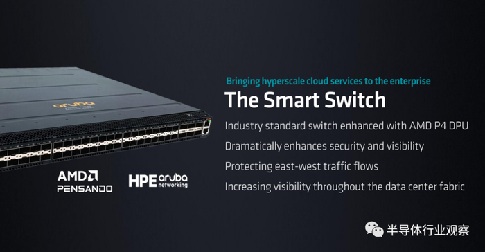 在这次的盛会上,AMD还披露了全新的DPU规划,这是他们通过收购 Pensando所获得的技术。在他们看来,AMD 的 Pensando SmartNIC 是新数据中心架构不可或缺的一部分。按照AMD的规划,他们接下来会将P4 DPU 卸载集成到网络交换机,从而在机架级别提供服务。为此,他们正在与HPE Aruba Networks 一起开发智能交换机。