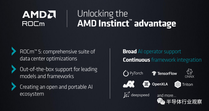 据Victor Peng介绍,AMD 拥有一套完整的库和工具ROCm,可以用于其优化的 AI 软件堆栈。与专有的 CUDA 不同,这是一个开放平台。而在过去的发展中,公司也一直在不断优化 ROCm 套件。AMD同时还在与很多合作伙伴合作,希望进一步完善其软件,方便开发者的AI开发和应用。