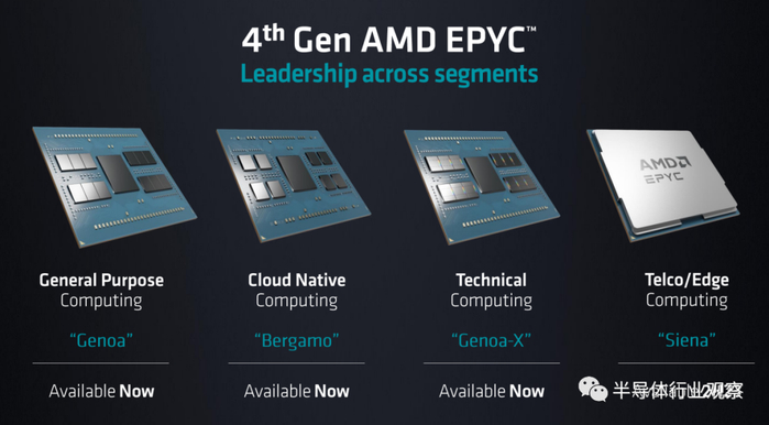 在介绍了MI300的同时,AMD在今天还介绍公司了另一款重头戏产品——新一代的EPYC。这是一系列为数据中心设计的芯片,到了第四代,AMD则准备了四条针对不同市场的产品线,当中更是包括了备受关注的、以云原生计算需求为目的的Bergamo系列以及代号为Genoa-X的第二代 EPYC 3D V-Cache CPU。