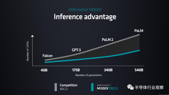 而在今日,AMD带来了公司的AMD Instinct MI 300X,一款专门面向生成式AI推出的加速器。和AMD Instinct MI 300A不一样,AMD Instinct MI 300X并没有集成CPU内核,而是采用了8 个 GPU chiplet(基于CDNA 3架构)和另外 4 个 IO 内存chiplet的设计,这让其集成的晶体管数量达到了惊人的1530亿。而为了缓解AI 大型语言模型 (LLM) 所面临的内存制约,AMD为这款芯片集成了192GB的HBM 3,其存储带宽也高达5.2 TB/s,可以处理的参数高达400亿。