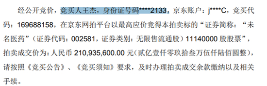 其中,王杰参与未名医药的部分股权法拍,其个人信息与世纪华通披露的内容一致。2023年4月22日,未名医药公告称,王杰在京东网拍平台以最高应价,竞得1114万股公司股份,拍卖成交价2.11亿元。