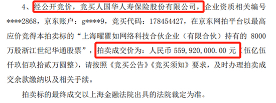嘉兴旭恺企业管理合伙企业(有限合伙)竞得8000万股世纪华通股份,拍卖成交价5.58亿元。