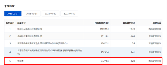 2016年前后,刘益谦开始多次参与云从科技增资,持股成本约1.345亿元。截至2023年第一季度末,刘益谦持有云从科技2427.84万股股份,持股比例3.28%,为第五大股东。