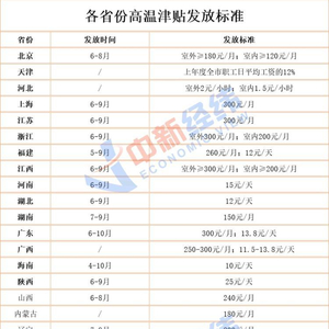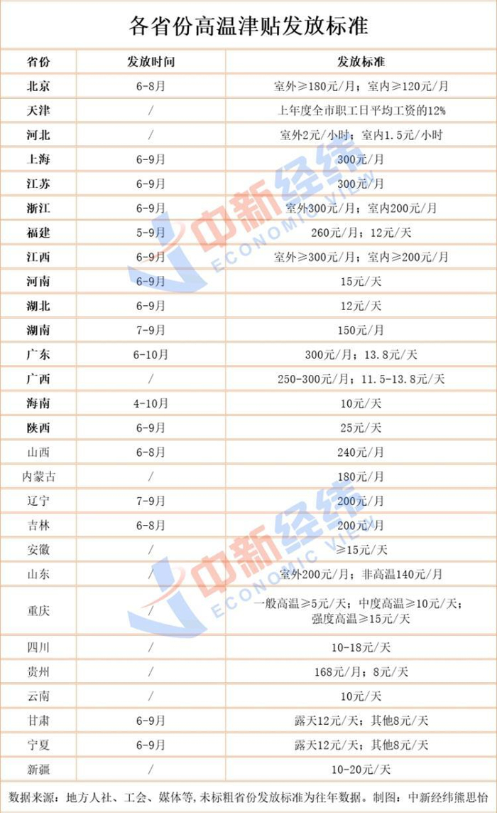 对比日标准,陕西“笑傲群雄”达25元;新疆紧随其后,高温津贴上限可达20元;四川位列第三,日津贴上限为18元;另有不少省份日标准在10~15元区间。